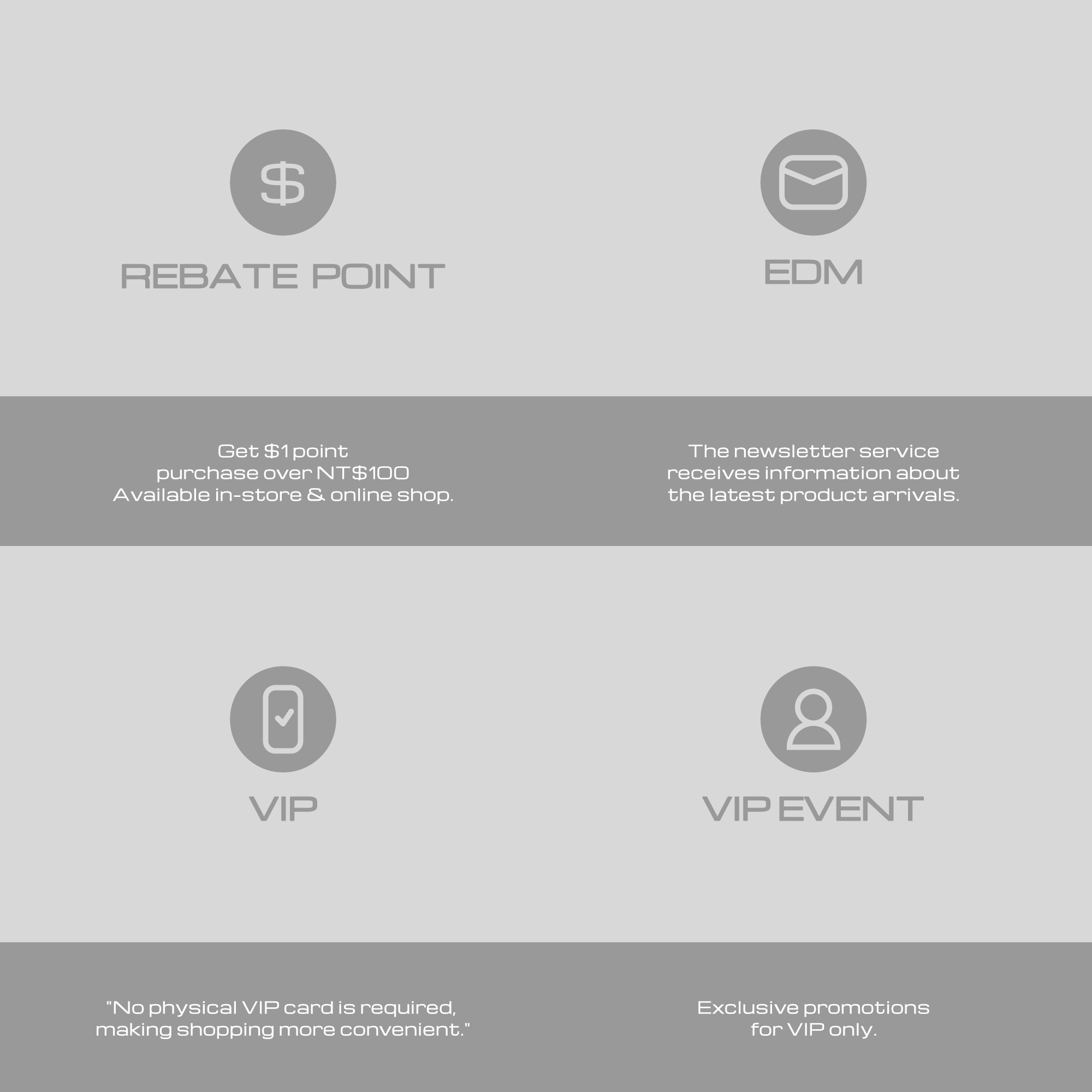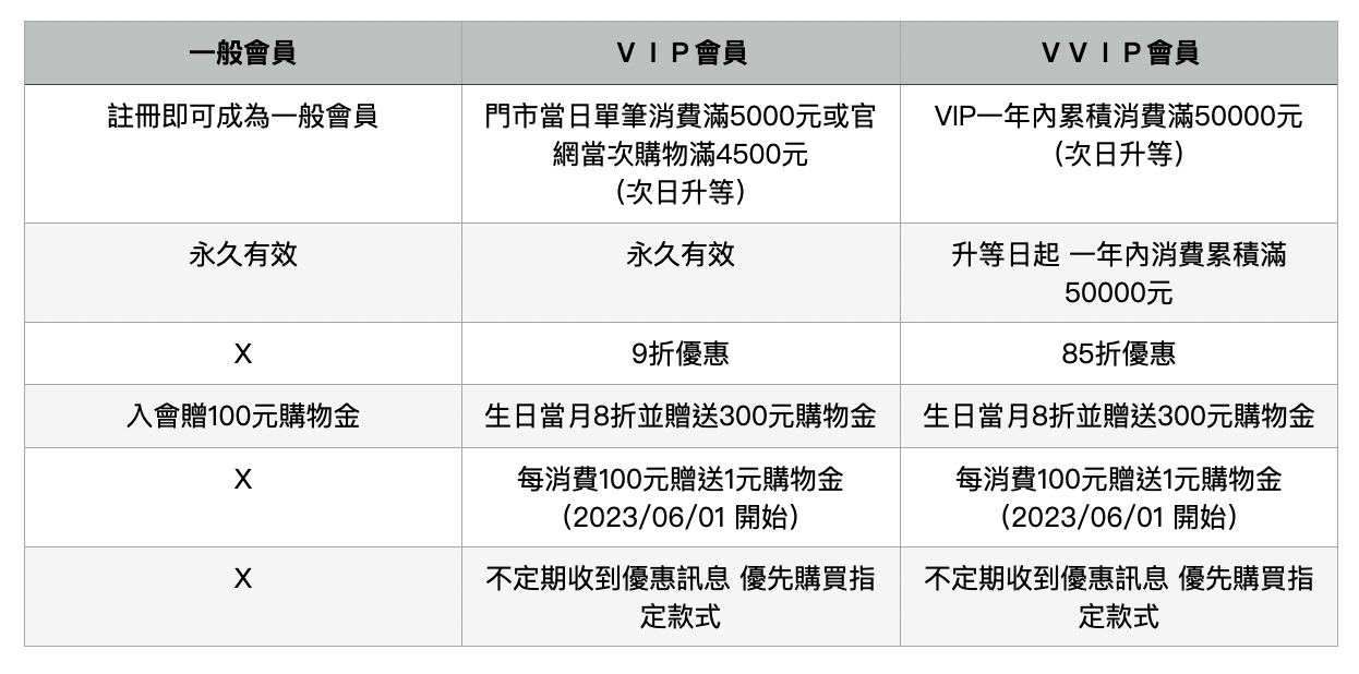 VIP及VVIP會員於官網或門市消費結帳金額每100元贈送1點,1點相當於1元購物金(累計計算)下次消費即可使用